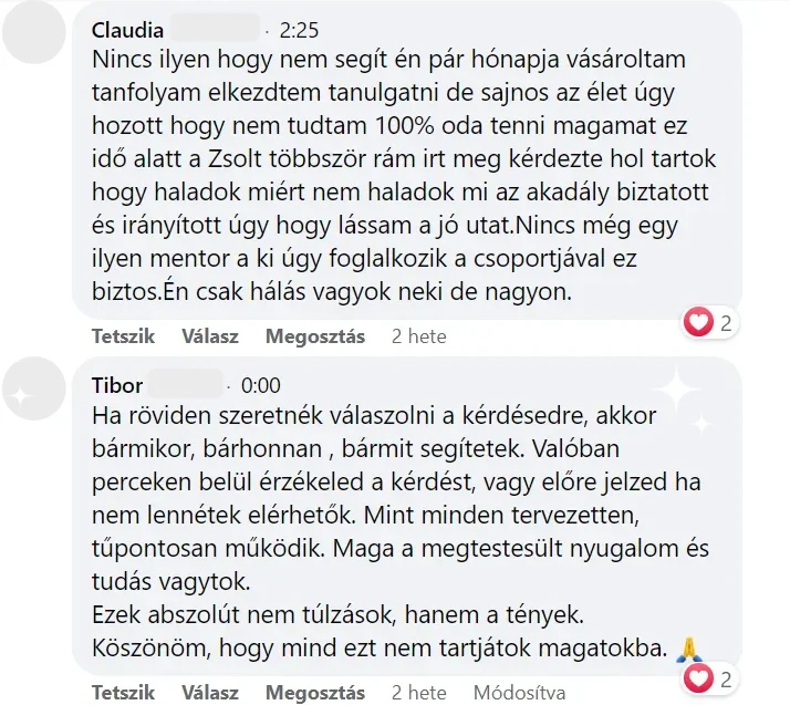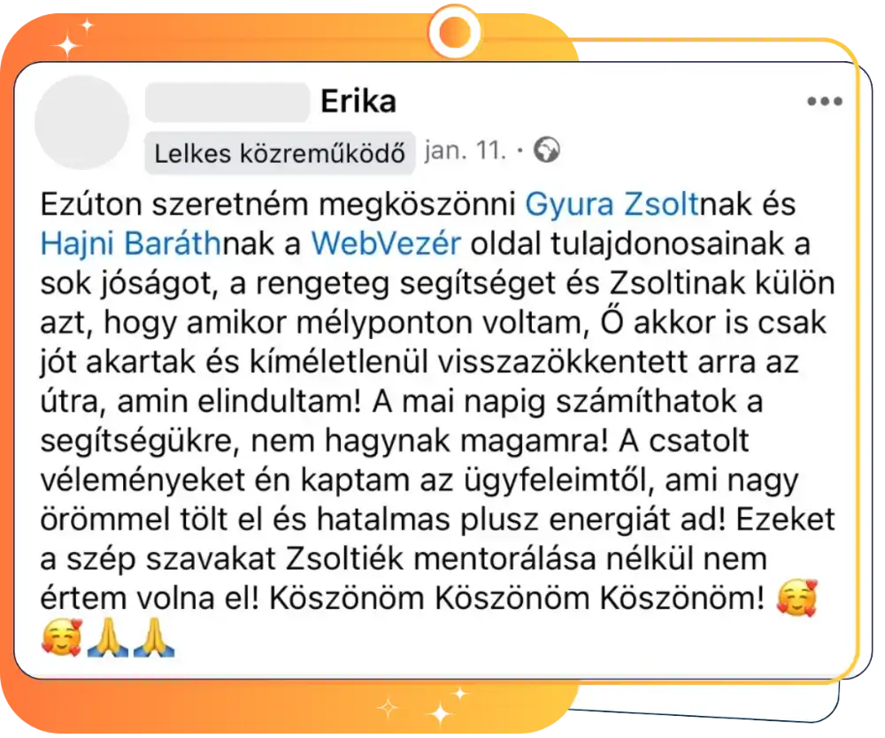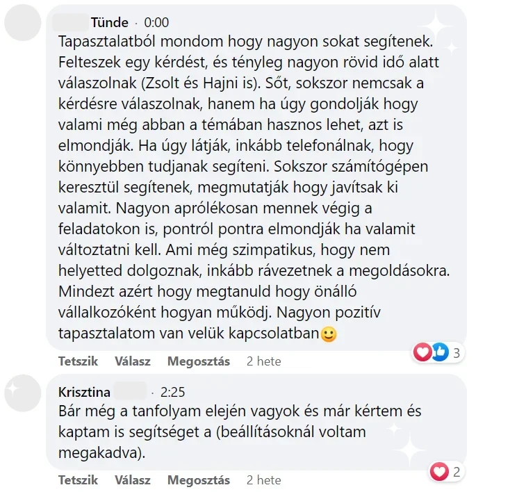 - Mentoring csoporttagság, ahol folyamatos támogatást biztosítunk, bármikor kérdezhetsz
